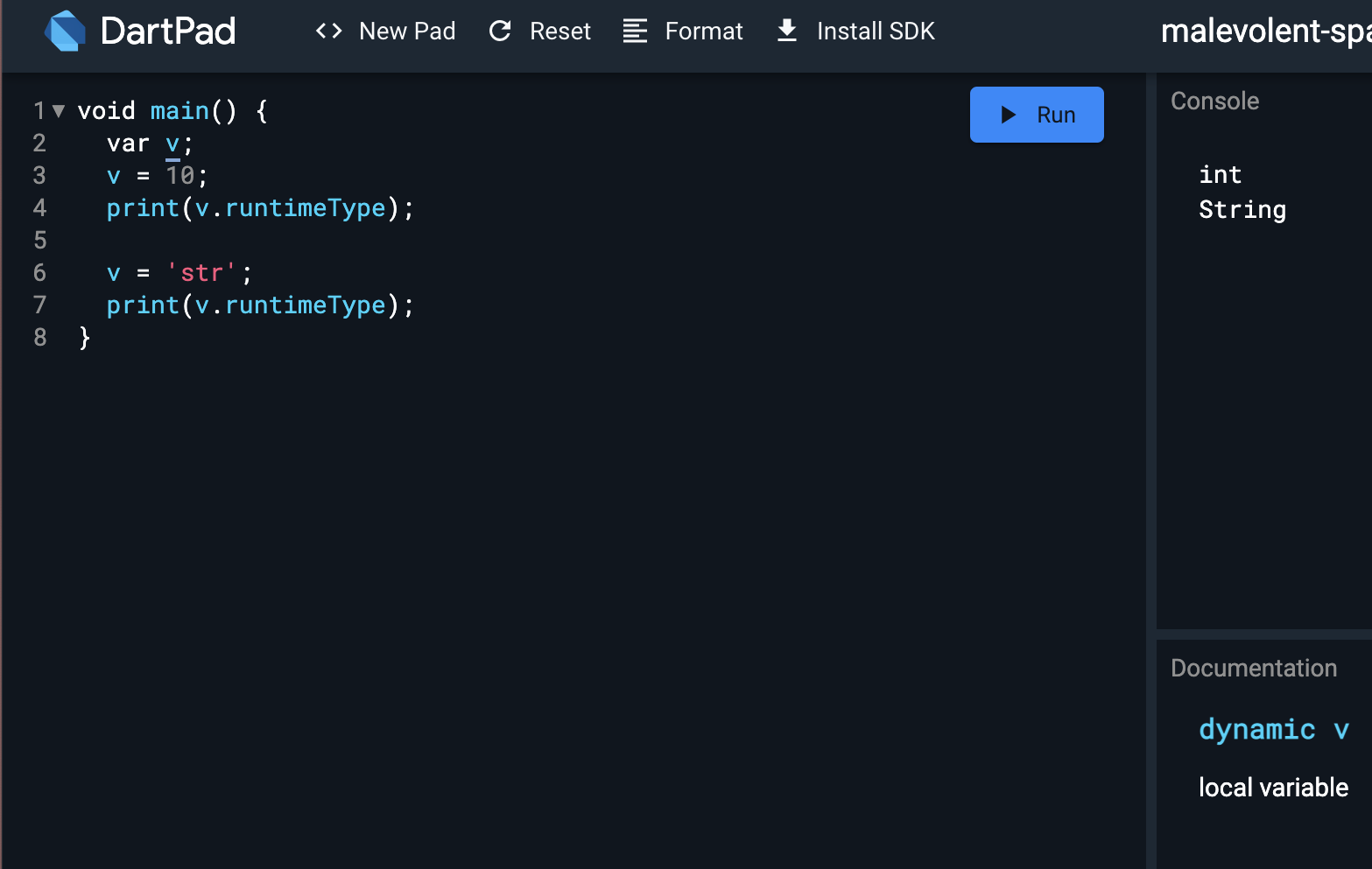 DartPad에서 변수에 마우스 커서를 두면 타입이 나오는 걸 이용해 맞는지 확인했다.