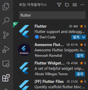 Extensions: Install Extensions엔터 누르면 확장 프로그램 설치 창이 뜨는데 검색 창에 flutter 입력하여 뜨는 확장프로그램 설치