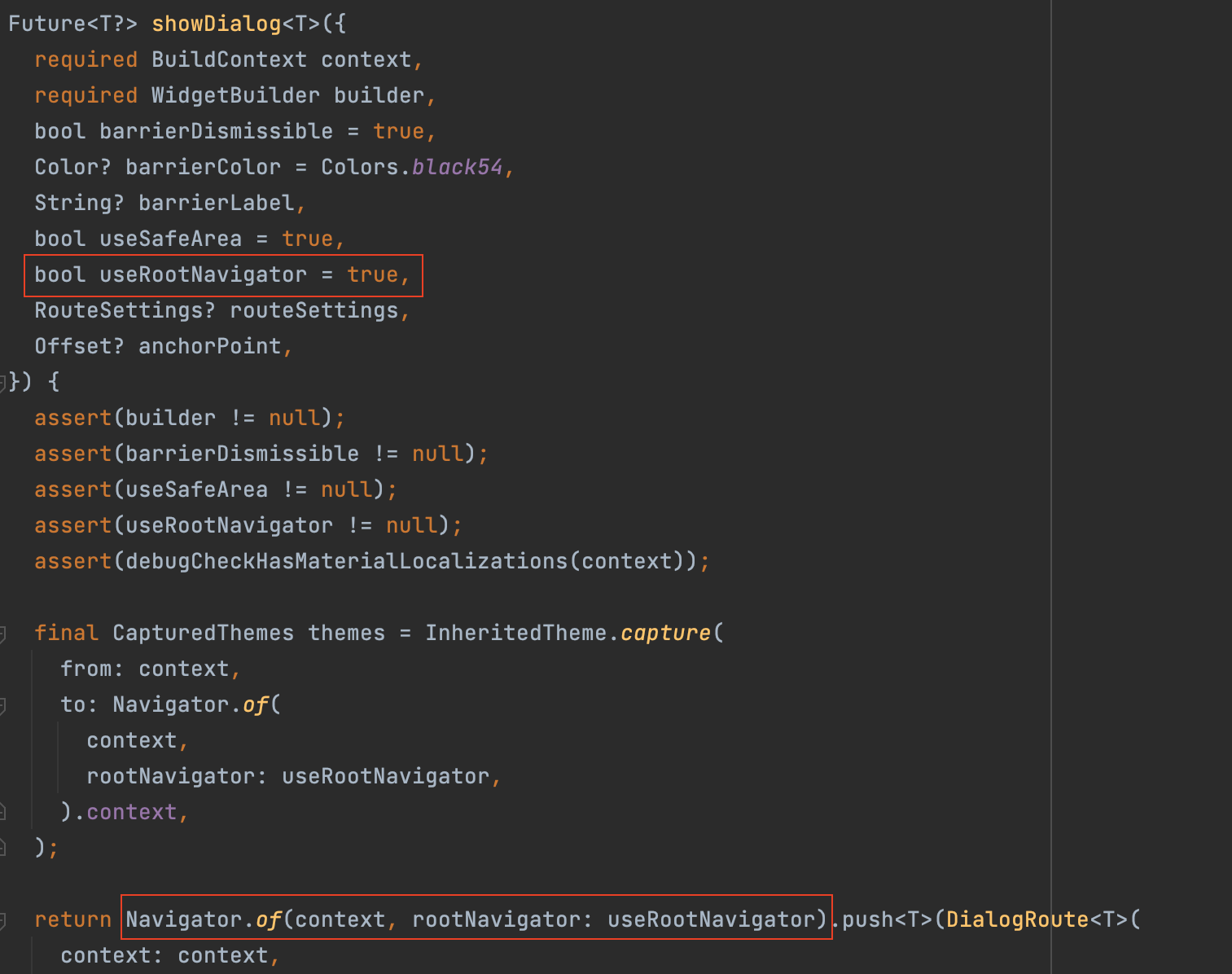 원래 Navigator.of는 위와 같이 기본적으로 rootNavigator가 false로 되어있어 하위 context를 기준으로 찾는 것인데 showDialog가 true를 넣어줘서 root의 Navigator를 가져온 것이었다.