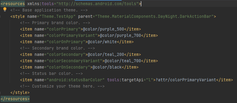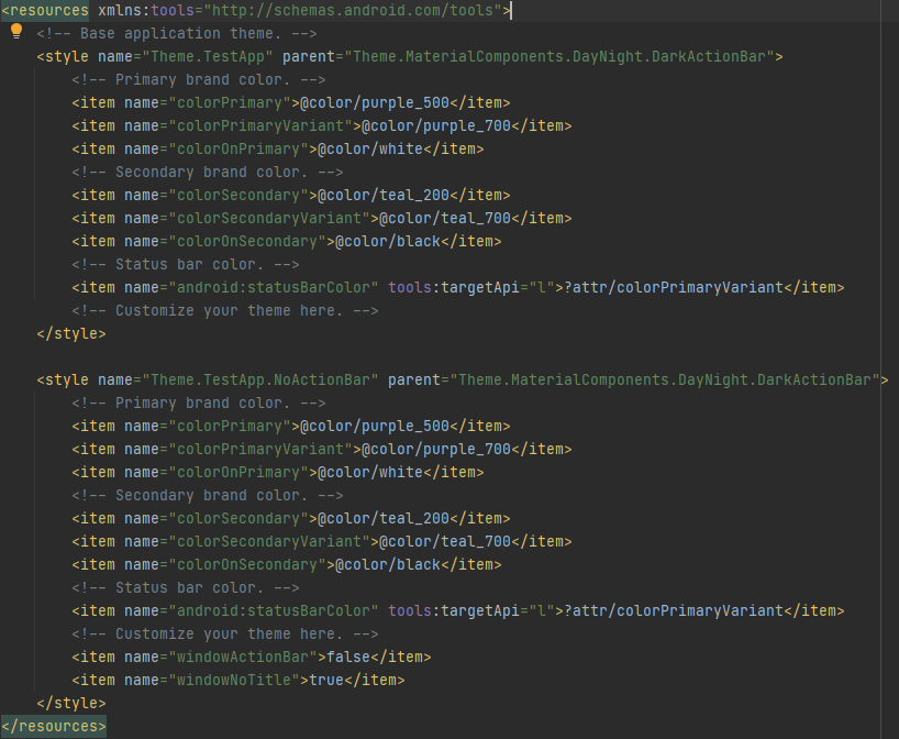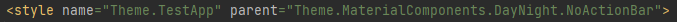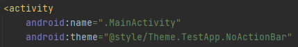 이제 app - manifests - AndroidManifest.xml을 열고 적용하려는 액티비티의 태그에 android:theme속성을 추가하고 값으로 @style/Theme.TestApp.NoActionBar를 주면 끝이다.