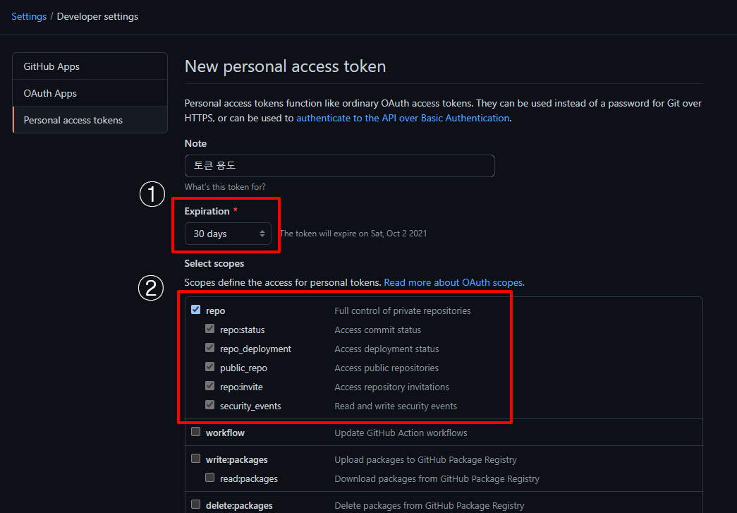 - ② 토큰 권한 설정(네모칸 외에 필요한 권한 있으면 추가)